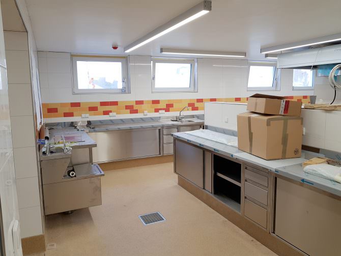 Bei der Küchensanierung im Therapeutikum in Heilbronn hatten wir zuerst für die Dauer von 1,5 Jahren eine Interimsküche in einem anderen Gebäude ausgestattet und aufgebaut. Neben der neuen Küche und Speisenausgabe, haben wir auch die Warenanlieferung und Lagerlogistik mit geplant und mit neuen Kühlhäusern ausgestattet. Bei der Umsetzung der Küche war es wichtig für die Patienten farbliche Akzente zu setzen und möglichst viele Arbeitsplätze für sie zur Verfügung zustellen.